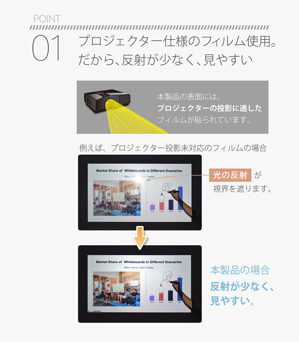 POINT01 プロジェクター仕様のフィルム使用。だから、反射が少なく、見やすい 本製品の表面には、プロジェクターの投影に適したフィルムが貼られています。例えば、プロジェクター投影未対応のフィルムの場合光の反射が視界を遮ります。本製品の場合反射が少なく、見やすい